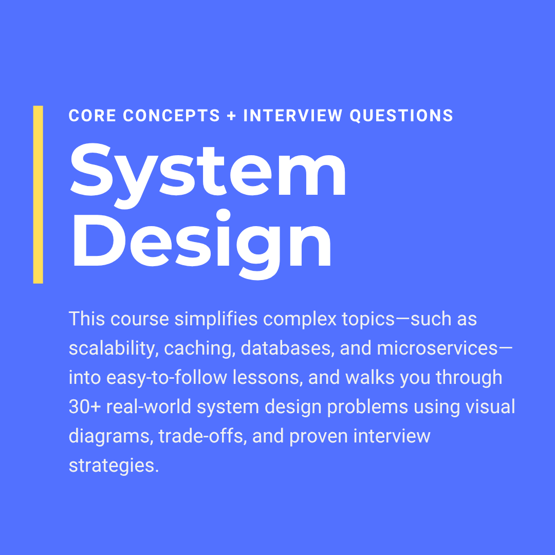 This course covers the core concepts of System Design along with the most-asked interview questions at top tech companies. Learn essential topics like scalability, caching, and microservices through simple lessons and 25+ real-world design problems with visual solutions.